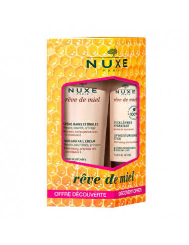 Este Kit descubrimiento contiene: 1 Crema de Manos y Uñas Rêve de Miel, con Miel, Girasol, Aceites Preciosos y Vitamina E, que nutre, repara las manos secas y dañadas, al tiempo que las protege frente al envejecimiento cutáneo prematuro, y 1 Stick Labios Hidratante Rêve de Miel, con Miel y Girasol, que suaviza los labios dañados o secos en cualquier momento del día.