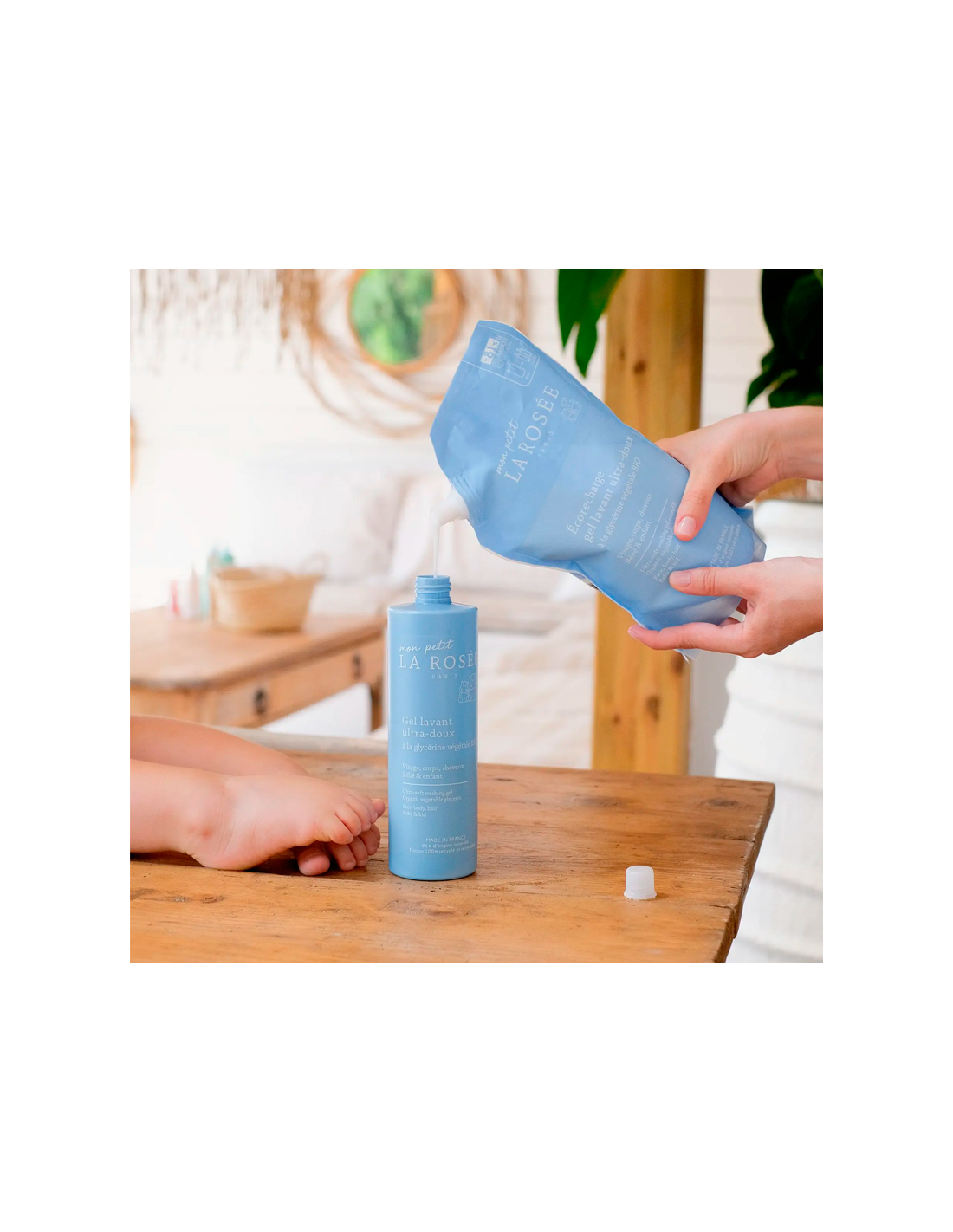 Cuerpo, rostro y cabello El gel limpiador ultra suave limpia suavemente el rostro, el cuerpo y el cabello en el baño. La textura de la espuma suave es fácil de enjuagar y no pica los ojos. ¡La piel y el cabello están perfectamente limpios, flexibles y con un agradable aroma! Protege la flora inmadura de la piel del bebé, gracias a sus principios activos muy suaves como la glicerina vegetal, el aceite de oliva y la alantoína.