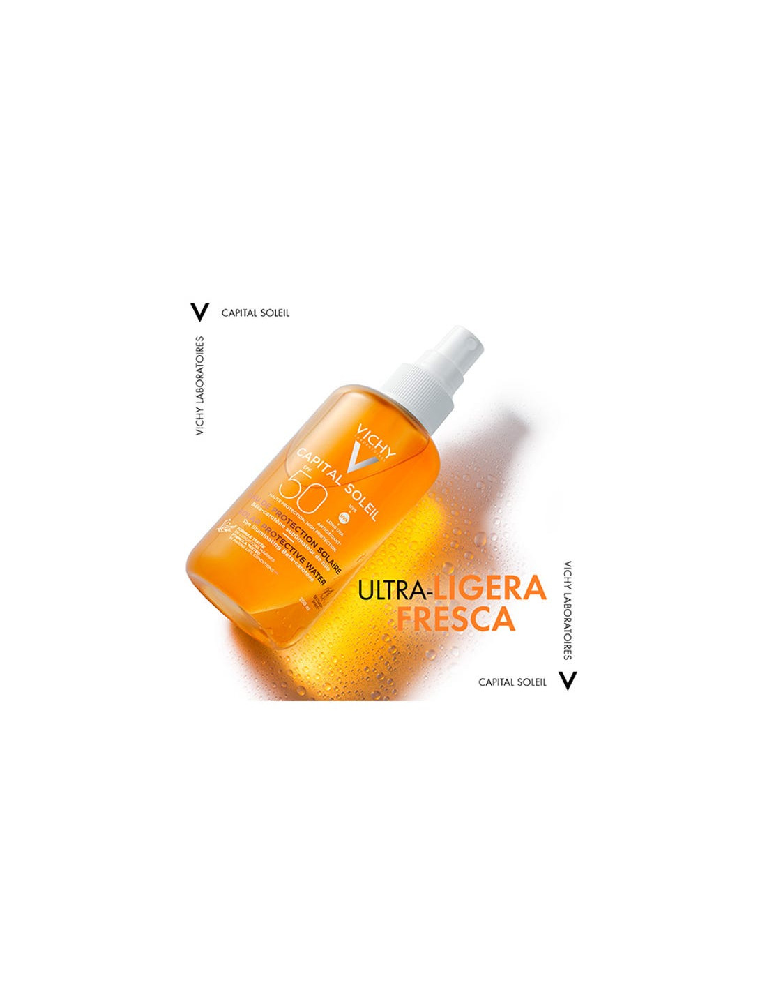 Agua Protectora Solar disponible en una versión iluminadora del bronceado con betacaroteno. Se trata de una fórmula que protege la piel del daño solar a nivel celular con una sensación de agua, la alta protección UV nunca ha sido tan ligera.
