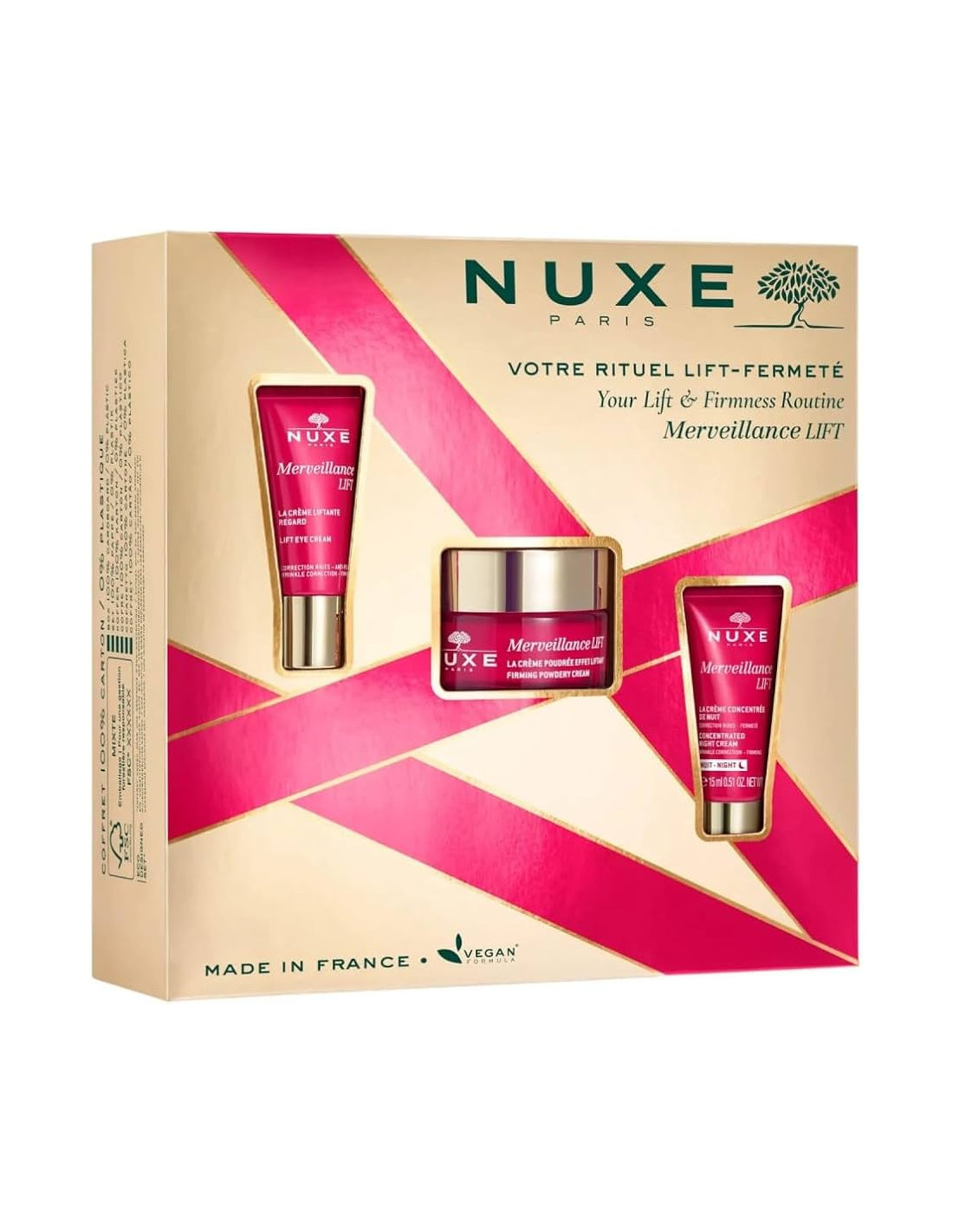Cofre formado por la crema de elevación y firmeza de 50 ml para rellenar las arrugas y redensificar la piel. Además de regalo viene con el contorno de ojos y la crema de noche merveillance para completar el ritual.